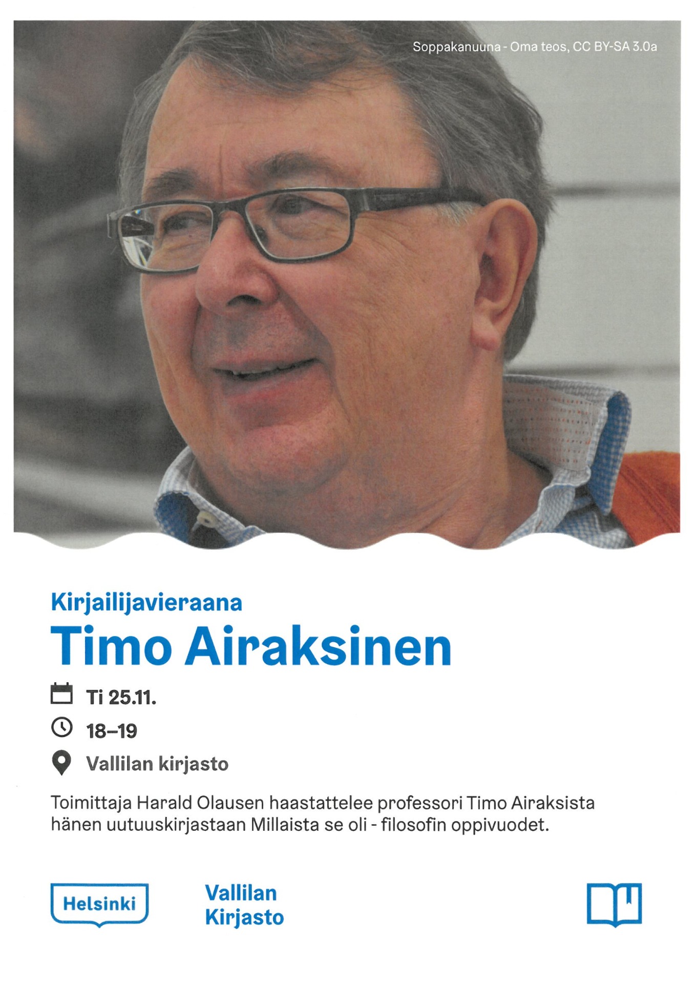 Professori Timo Airaksinen vierailee Vallilan kirjastossa Helsingissä puhumassa kirjastaan Millaista oli - filosofin oppivuodet 25.11 kello 18-19 haastattelijana toimittaja-kirjailija Harald Olausen. Airaksinen on parhaillaan Puolassa ja saapuu ensi viikolla Suomeen puhumaan kirjastaan (Raisio, Turku, Vallila Helsinki, Valkeakoski, ja päättää...